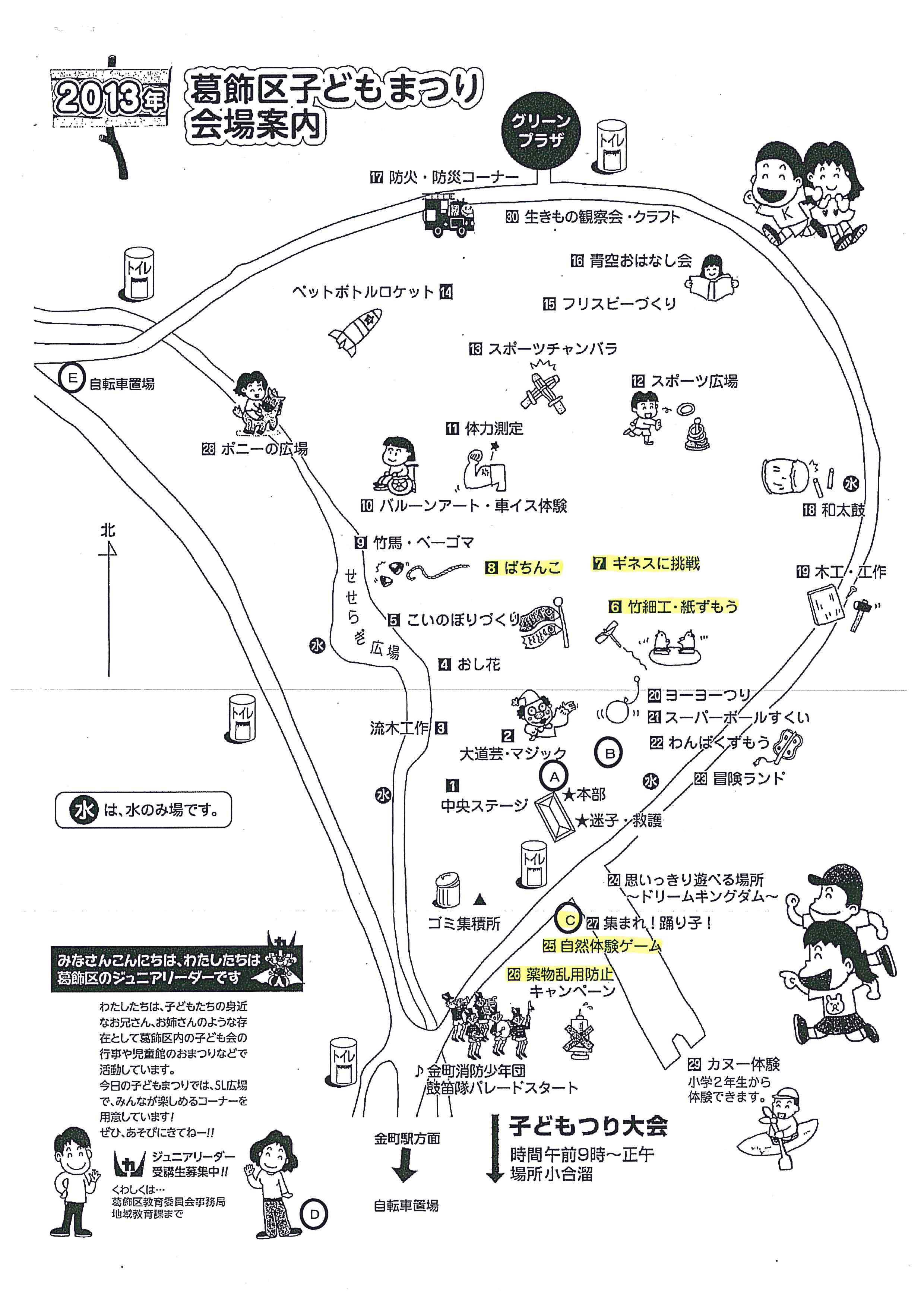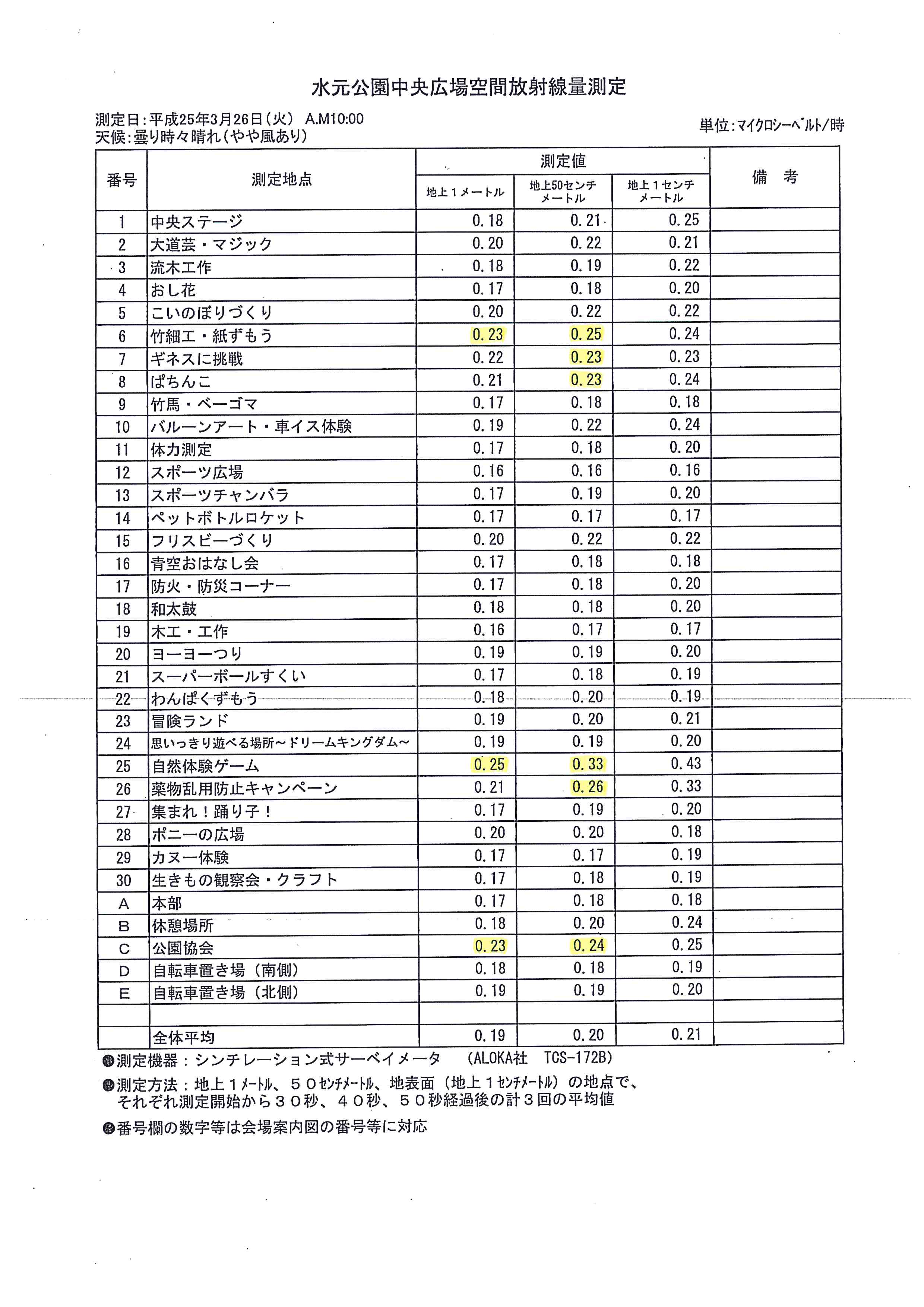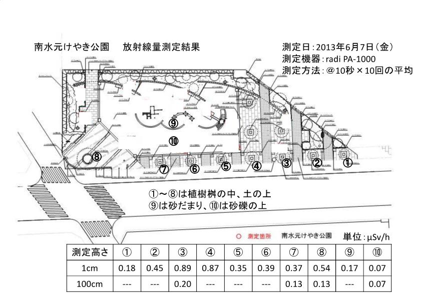 地上50cmで0.23μSv/h以上の地点が35か所中6か所、地上1mでは3か所あった。区の測定は子どもまつりの開催準備のためにおこなわれたもの。結果は以下のとおり。
